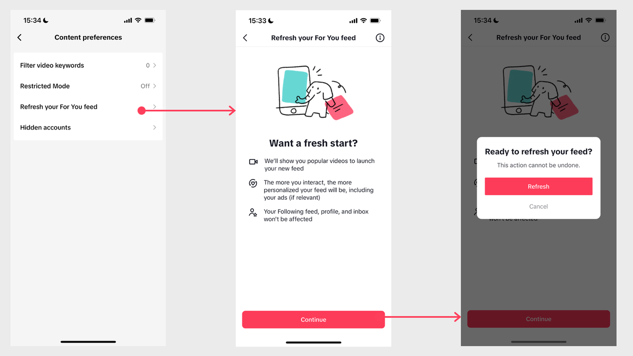 【推荐】页 (FYF) 提供各种专为个人偏好量身定制的高质量内容,也是 TikTok 能够在一众平台中脱颖而出的关键所在。举例来说,如果你特别钟爱脱口秀演员在现场与观众互动的视频并且从头看到尾,你的【推荐】页就会呈现更多与观众互动的脱口秀表演视频;如果你不假思索地划走一段 ASMR 视频,那么【推荐】页就会减少推送 ASMR 内容。